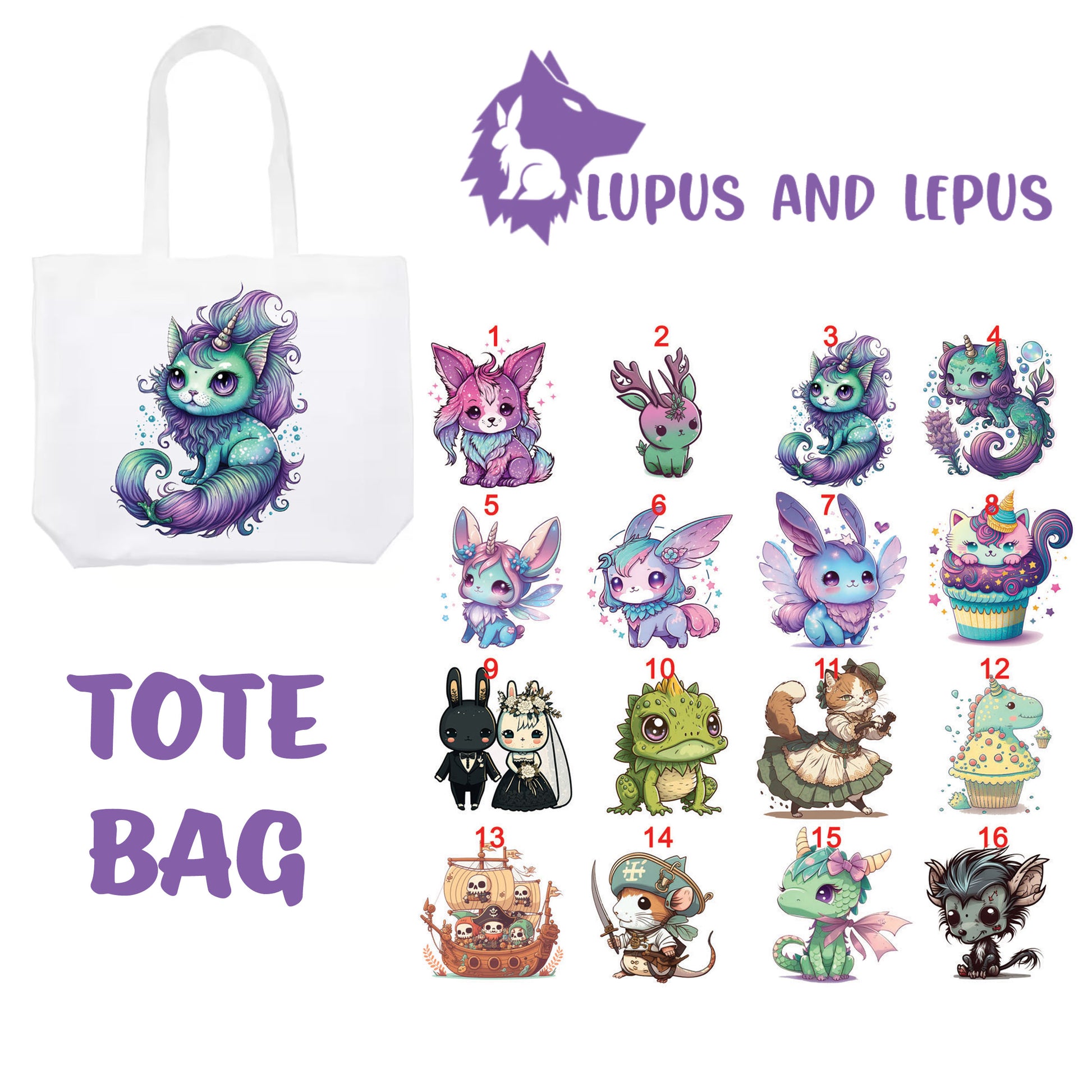 TOTE BAG 1 - My Art tote bag, dragons, colorful, bunnies, faries, fairy, faery, magic, mythical, bear, giraffe, wearwolf, lizard, dinosaur,